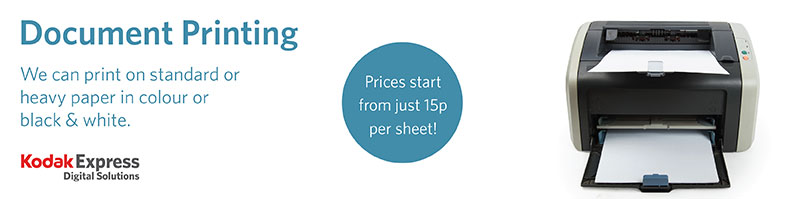 To make it easy for you to print your documents quickly we have laptop and internet facility in store. We recommend you bring your document on a USB pen drive, however we can also print from memory cards, mobile phones and CDs. You can also send us your documents by email before coming into the store to kodakprints@gmail.com and they will be printed when you come to collect them.